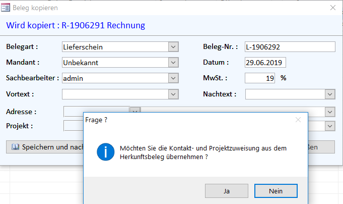 ![]() Die vorhandene Projekt- und Kontaktzuweisung aus dem Herkunftsbeleg lässt sich wahlweise übernehmen.