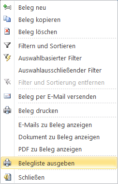 ![]() Der Inhalt aller in der Ausgabeliste angezeigten Beläge ist davon abhängig, welche Vorauswahl in der Belegauswahl getroffen wurde. Innerhalb der Listenvorschau lassen sich weitere Filter setzen (Kontextmenü), z.B. nach Mandant, Belegtyp, Summenwerten usw. Ausgegeben wird immer der gefilterte und angezeigte Listeninhalt.